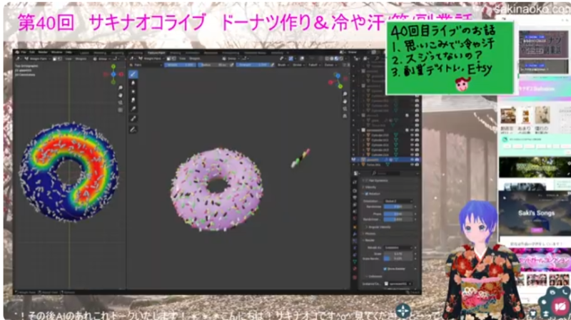 Blenderでドーナツを作りましたが、ライブ中でもお話ししたように、初心者の頃ブレンダーグルの動画で途中行き倒れた経緯があるので、細かいところはさておき、15分で作れるようになったかあ~と感慨深いものがありました。